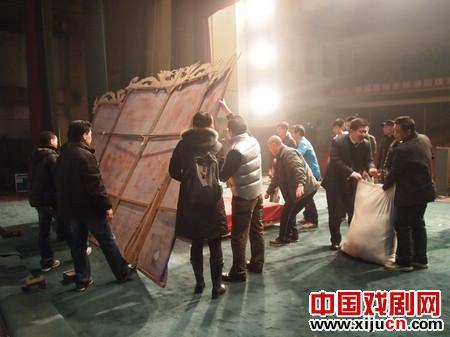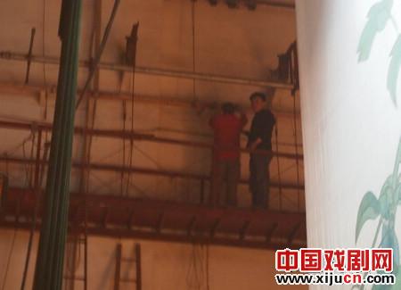 此次的演出地点是聊城影剧院,据介绍,这是一座具有50多年历史的文物级老剧院。半个世纪的风雨洗礼早已让剧院的外观显出了苍颜,内部的陈旧设施也见证了数十年以来无数次的幕起幕落。这座和北京人民大会堂同年建成的剧院已成为了当地的一级文物,出于对文物的保护,剧院所有设施都保持原始状态不得翻新。就是这样一个还处在上个世纪50年代演出设备的老剧院,让舞美队的13位成员为装台付出了巨大的辛劳。舞台顶部七根吊杆无一可以升降或移动,为了能够挂上自带的背景大幕和纱幕,李继勇带领的舞美队集中生智,就地取材,齐心协力自制了“土吊杆”。做完吊杆后,李继勇、马川、李健等几位同志顺着难以攀爬的脚手架来到数十米高的栅栏天顶上,他们在天顶所站的位置被称为“马道”,狭窄而空旷,由于年头已久,用木板做的“马道”咯吱作响甚至有局部断裂,就在这样危险的地方,几位同志顺着吊绳用尽全身力气将极其沉重大幕吊起。接下来是调整灯光,依旧因为吊杆的问题,只能采取一个人站在移动的脚手架梯子上,下面几个人推着移动梯逐个调整光的位置。灯光组的李永泉、朱丹等同志还将剧场线路重新调整,用自带的设备为个别灯光单接了一条线路,保证了正常演出的效果。舞美队几位年过半百的同志在装台过程中也不顾年事已高,在艰苦的装台工作中挥洒着他们的汗水。一天一夜的装台工作直至演出前一小时才告完毕,高强度的劳动早已让舞美队的同志们直不起腰,但是看着完美的劳动成果,他们的脸上露出了欣慰的笑容。晚上,大幕随开场锣开启时,他们又各就各位,为演出的圆满完成默默坚守自己的岗位。直至两天的演出全部结束后又开始了辛苦的卸台、装车工作。