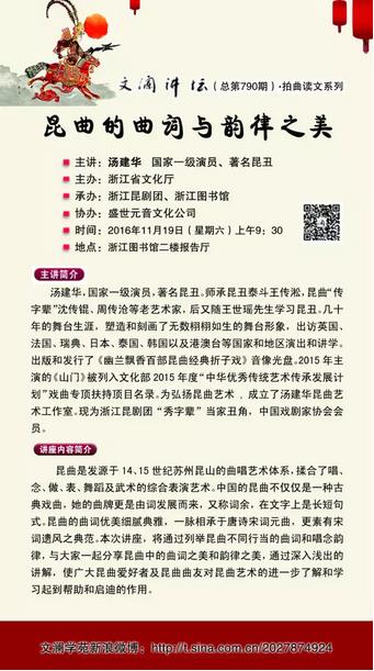 本次讲座,将通过列举昆曲不同行当的曲词和唱念韵律,与大家一起分享昆曲中的曲词之美和韵律之美,通过深入浅出的讲解,使广大昆曲爱好者及昆曲曲友对昆曲艺术的进一步了解和学习起到帮助和启迪的作用。
