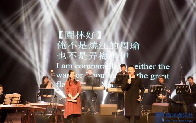 音乐会的第一曲名为《撼亭秋》,“缭乱粼光缓浮沉……”在悠扬婉转的古笛声中,张军和搭档余彬用婉转的唱腔拉开了本场音乐会的帷幕,随后的几曲《风入松》《园林好》《醉花荫》《琴歌》共同营造出一个能够走近人心深处最幽微情绪的艺术世界。在这个故事里,张军扮演的张若虚历经爱慕痴怨、行游阴阳,以短暂渺小的人生,直面茫茫无垠的时空。当他在鬼仙的帮助下再返明月桥头,红颜已成白发,人世盛衰刹那,唯江月恒长,在这沟通天地日月的一瞬,《春江花月夜》的三十六句就此喷涌而出,这首千古绝唱从此有意义,有了缘由。