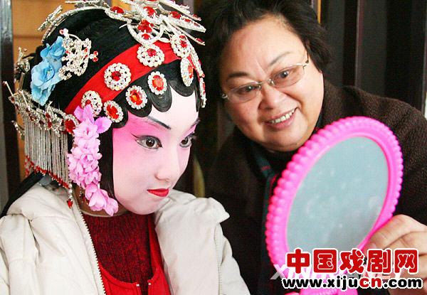 12月7日,苏州昆曲老艺人石坚贞和剧中扮演“杜丽娘”的小学生俞熙雯一起端详完妆的样子。 新华社发(王建中 摄)