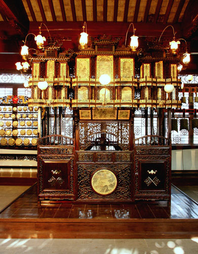 正面屏板上方是“宝和堂”额,上档精雕牌楼式顶额,缀有双排饰白玉狮子的栏杆,双层飞檐,缀镶珊瑚宝石。顶端三面出挑莲茎形铜梗,悬挂玻璃莲花彩灯,灯底是薄铜片花萼,可安装电珠或插上蜡烛,夜间演出灯彩辉煌、华丽缤纷。