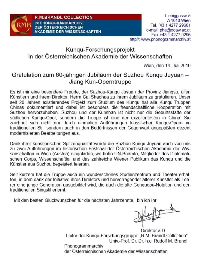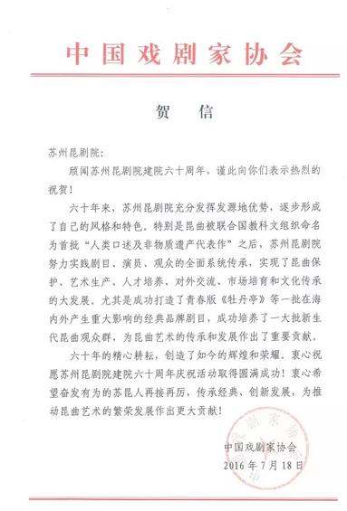 值此苏州昆剧院成立六十周年之际,向昆剧院各位表示我由衷的祝贺。