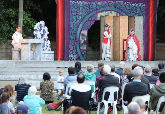 丛林叠翠中,精巧别致的一座中国戏台傍山而立。汤显祖经典作品的唱响与中国知名昆曲演员的到来,吸引了新西兰前驻华大使、惠灵顿维多利亚大学孔子学院理事长包逸之、新西兰少数民族事务部民族事务署署长陈雯、中国驻新西兰大使馆文化处主任沈鸣、新西兰知名作曲家罗斯·哈里斯、新西兰弦乐四重奏乐团海伦·波尔与鲁道夫·吉尔斯坦、维多利亚大学戏剧系高级讲师及戏剧导演梅根·埃文斯博士等众多嘉宾,以及近300位慕名而来的新西兰中国戏曲迷与华人华侨观众。