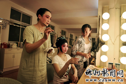 演出结束,演员们匆匆回到化妆间卸下头上及脸部的“重担”,团长罗艳一边卸妆一边对刘婕饰演朱丽叶书写的手部动作进行了分析点评,为8月5日赴英国演出作反复微调。