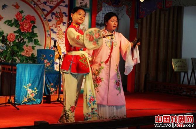 随着昆笛响起,拿着折扇的杜丽娘和拿着团扇的春香就走出舞台,这时候我突然发现台上唱戏的“杜丽娘”,就是刚才替我们检票的女孩子,虽然她们都是小镇姑娘,但一招一式都表演的非常投入,尤其是脸上哀怨的表情倒也楚楚动人。