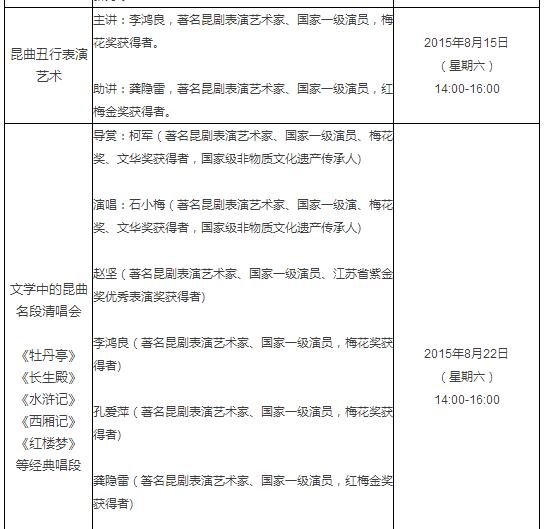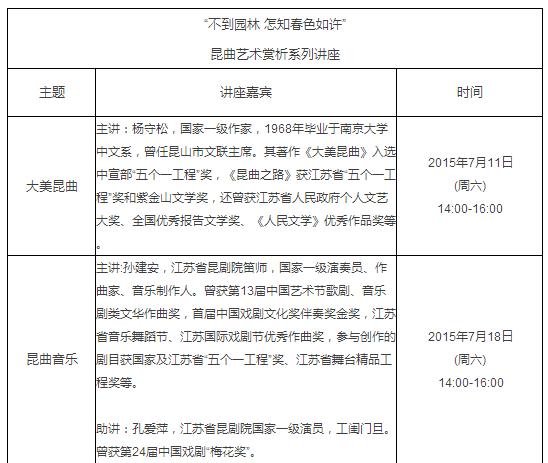 由国家图书馆、江苏省演艺集团昆剧院、江苏省昆山市文化广电新闻出版局联合主办的“不到园林,怎知春色如许”昆曲系列讲座,从7月5日至8月22日的八个周末,将连续在国家图书馆总馆北区学津堂举行八场,邀请多位昆曲名家和文化学者开讲,学者从昆曲行当、音乐、文学等各个方面解析昆曲,传播昆曲之美。