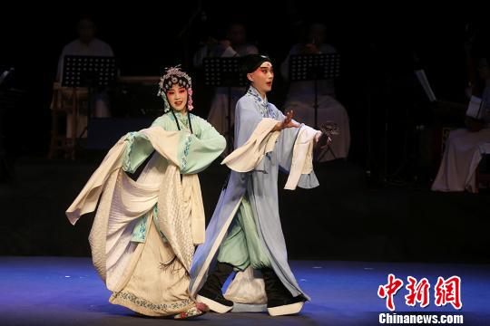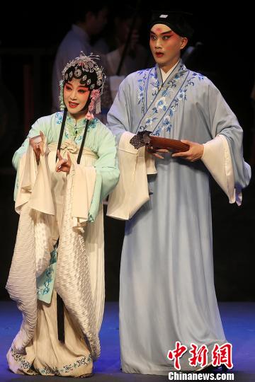 著名昆曲表演者单雯(左)和张争耀(右)表演昆曲名段《幽闺.踏伞》。