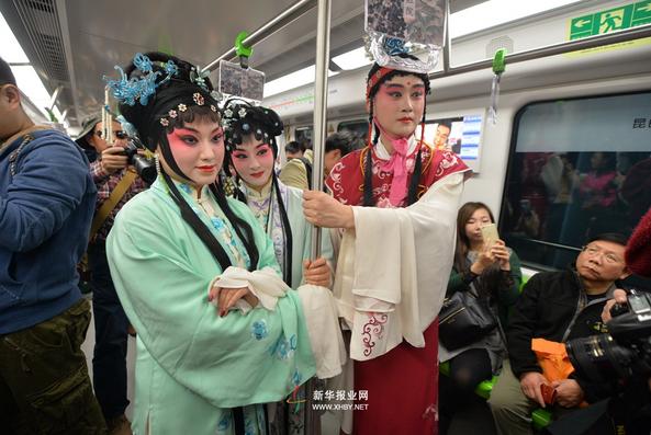 这已经是昆曲与地铁的第三次牵手了。昨天,南京地铁特意开出了一趟“红楼专列”,原来的六节车厢变身为《红楼梦》中六个经典故事的发生地:应天府、怡红院、蘅芜苑、沁芳桥等。列车的海报位及椅侧贴等位置也是与地名相关的经典红楼梦片段,每节车厢都是一段“红楼故事”。市民纷纷拿出手机,与“红楼”来一段亲密接触。地铁运营有限责任公司徐建国副总经理告诉记者,地铁三号线被设计为“红楼专线”,全线29个车站中有9站以“红楼”为主题。“太虚幻境”、“元春省亲”、“金陵十二钗”等《红楼梦》中的经典场景都能在各站文化墙上看到。他说,“我们一直力推‘人文地铁’的概念,要让地铁成为奔驰在金陵地下一条灵动的文化传播纽带。”