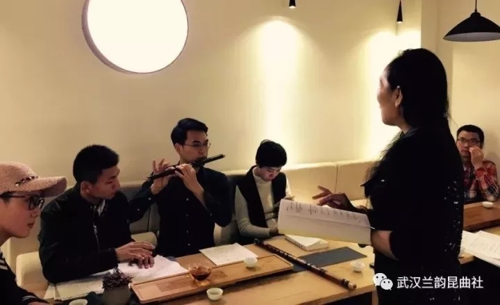 在酒店包房,李辉老师与武汉曲友们团坐,就习曲要解表达了自己的灼见。并提出了曲友们在曲唱中须要注意的问题。特别谈到昆曲的咬字、气息、顿挫、砸夯、虚实。并为曲友们示范了喊嗓,如何从本嗓到小嗓,最后回归本嗓。李辉老师还与笛师于洋交流昆笛吹奏的技法,二人互相切磋,津津乐道。伴随着一曲《步步娇》,这次重阳曲会雅集圆满结束。