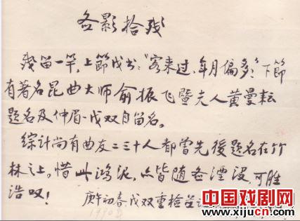 上述“周家曲社”中没有仲眉夫妇老曲友滑苕白和许豪士的身影,是因为滑在抗战期间留在天津;许到了四川万县,但彼此不通音信。直至1941年,仲眉才得到许的信函,喜出望外,以诗代柬曰:“...乐游忆京华,同好水磨腔。击节赏仙音,豪歌意激昂(君善冠生,嗓音极佳)。霞骛清三醉(昆曲《三醉》出中有“趁江乡落霞孤骛”之句),山河壮八阳(昆曲《八阳》出中有“收拾起大地山河一担装”之句)。岂料伤心事(《闻铃》出中有“提起伤心事。泪如倾”之句,都下曲友均嗜唱此曲),曲谶验沧桑。...料应歌代哭,心印讵相忘?...愿早复神州,浩劫消红羊。言旋故都门,太掖泛晴光。双寄楼中聚(豪士、苕白同寓津门时,曾题寓居曰“双寄楼”),倾醉举霞觞。合唱《仙圆》曲(《仙圆》为《邯郸记》中出,叙卢生得道会诸仙事),其乐也洋洋。”