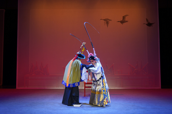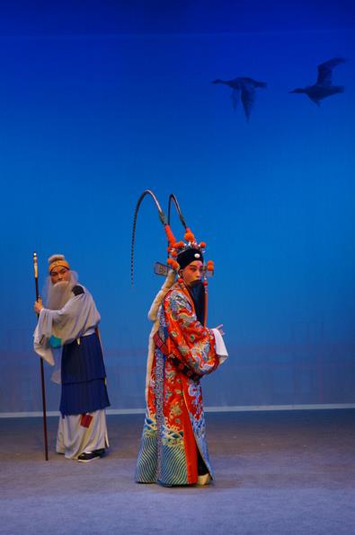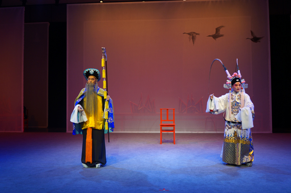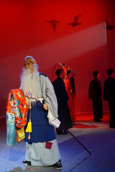 《望乡》的舞美亦极为简洁,背景中只有三只飞雁,舞台上只有两把椅子。