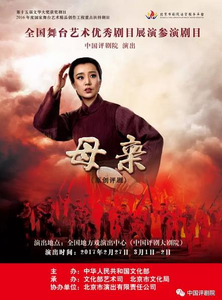 2017年2月至3月,来自全国14个省市、中直院团的18台优秀剧目将汇集北京,参加由文化部主办,文化部艺术司、北京市文化局联合承办,北京市演出有限责任公司协办的“全国舞台艺术优秀剧目展演”。中国评剧院创排的英雄史诗《母亲》将作为开幕大戏于2月27日、3月1日至2日在全国地方戏演出中心(中国评剧大剧院)隆重上演,为此次展演拉开序幕。