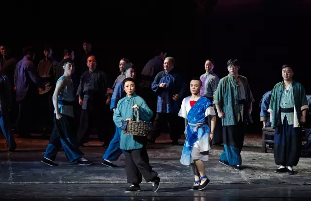 从戏剧开端就有一个被称作“小仔儿”的男孩出现,他贯穿戏剧始终,跳进跳出,极为自由。他向母亲提各式各样的问题,母亲为他讲述自己是如何出嫁,大脚新娘怎么赢得了老汉……他的爹爹一抱,从此有了四个虎头虎脑的小后生。在四个哥哥牺牲以后,他要陪爹娘过年,替哥哥尽孝。这里有一段台词,很有意思,充满情趣,既生活又浪漫,在这里艺术张开想象的翅膀,在生活中尽情翱翔。