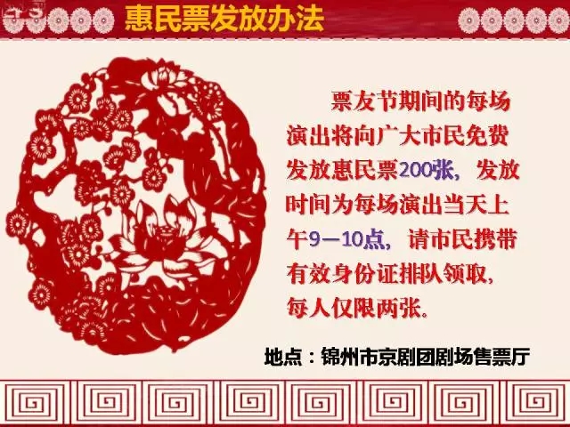 届时,将向广大市民每场免费发放200张文化惠民票。其中,21日晚7点举办开幕式及演出,22日至23日晚6点30分举办京剧专场演出,24日至25日晚6点30分举办评剧专场演出,演出地点均设在市京剧团剧场。惠民票发放时间为演出当天9点,请携带本人身份证到市京剧团剧场领取,每人限领两张,发完为止。