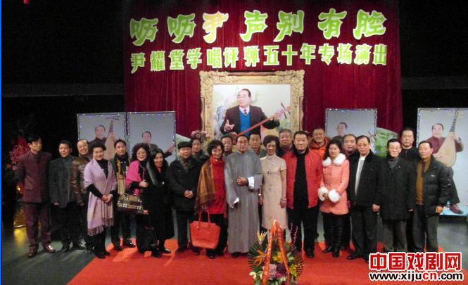 蒋调名票尹耀堂先生很谦虚,是“学唱”,还说只“五十年”,其实不止啦,他十四岁就开始学唱评弹,远不止五十年了,离六十年很近的呢。他们借用了一弹词名句为这专场取名:《呖呖“尹”声别有腔、尹耀堂学唱评弹五十年专场演出》,这次尹耀堂先生六番登台。学唱评弹宗师蒋月泉不同时期的经典唱段,风采不减当年,龙马精神依旧。并有二省一市的评弹票友登台祝贺演出,来得最多的是苏州票友,海外英美港台也有朋友来贺,不过都是华裔,黄皮肤黑头发的,不介绍你分辨不出。还有澳洲朋友从网上得知消息,人虽没法来,打来电话祝贺。