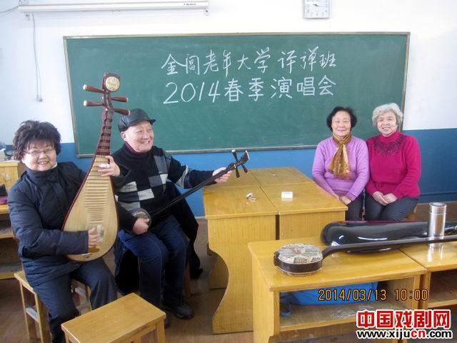 金阊老年大学评弹班创建于2008年在曹孟渔、徐雪玉老师的引领下已初步打下基础,并在一些场子里进行节目汇报演出。近两年来,在董尧坤、倪怀瑜老师的指点下,为培养学员的演唱能力,鼓励自弹自唱方面取得了新的发展。日前举办了春季演唱会作为大胆尝试,一共演出了八个节目。