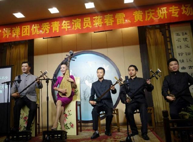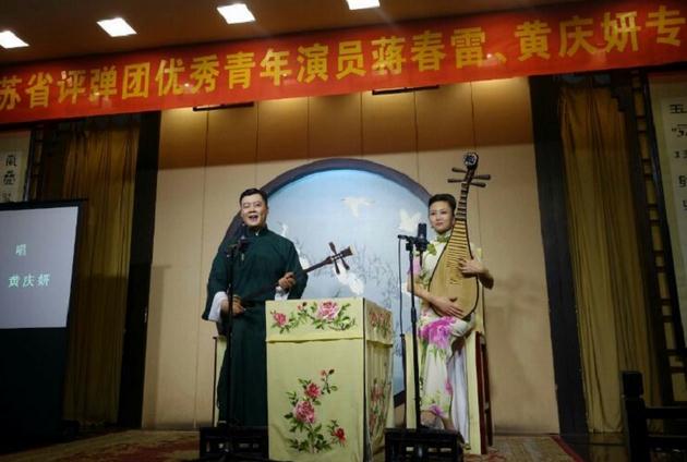 江苏团评弹团团长姜永春介绍了蒋春雷、黄庆妍两位青年演员,自16岁进评弹学校以来书坛生涯也有24年了,如今40岁了,去年蒋春雷被评上一级演员,也是目前评弹界最年轻的一级演员。