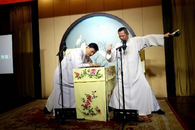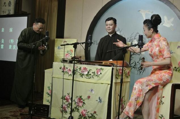祝贺演出其中有一回双档评活《英烈.父子交兵》,由姜永春、汪正华开讲。这两位金派评话传人,如今是评话界的佼佼佼者。说表、脚色、功架、形态、口技都令老听众赞口不绝,掌声连连。如今他们作为老师辈一代评弹人更感到责任重大-培养新人,所以近两年来连续搞了一系例中青年专场演出,为触动、锻炼、提升他们的艺术,提供平台,起到了积极有效的作用。