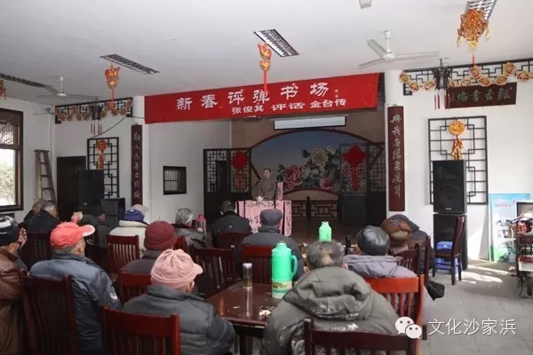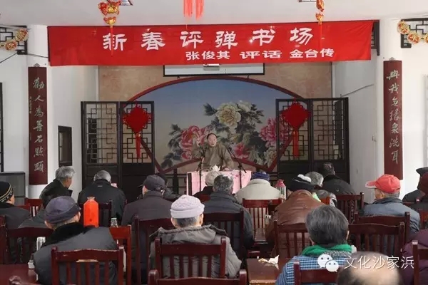 沙家浜镇红红火火过大年系列活动受到群众的欢迎,尤其是评弹书场更是得到老年人群的喜爱。2016年春节期间,沙家浜镇文化站邀请无锡评弹艺术团的张俊其老先生为老年朋友带来了评弹《金台传》。年初一下午一点准时在飘香园评弹馆开讲,三点半左右结束。一方面丰富了群众的文化生活,另一方面又可以弘扬传统文化艺术,深受群众欢迎。