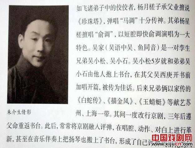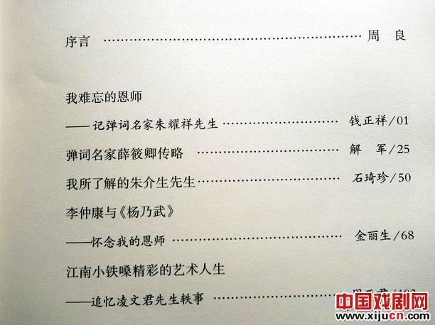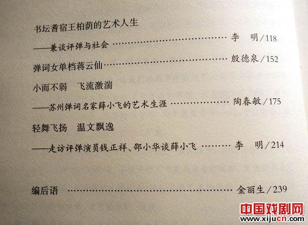 继上海人民出版社不久前出版的《评弹名家》(蒋月泉传、朱慧珍传、周云瑞传、徐丽仙传)系例丛书,由古吴轩出版社新出版的《苏州评弹艺术家评传》第一集与您见面了。该书由苏州评弹表演艺术家传承研究会承办编撰,经九位作者历两年多时间的多次采访,刻苦撰稿,并反复修改整理,聚集了共有朱耀祥、薛筱卿、朱介生、李仲康、凌文君、王柏荫、蒋云仙、薛小飞八位前辈艺人的评传。从中我们可以了解到每一位成功艺术家背后的辛酸史,也可让读者了解到艺人生涯中的往事,不失为评弹轶事,具有一定的可读性和历史价值。不久将在百花书店上柜,价定35元。