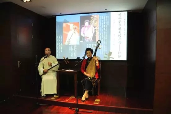 华先生一开场便用姑苏评弹特有的形体动作和吴侬软语“万福”、“倷好”向所有听众问好,接着用评弹的“说、噱、弹、唱、演”和“理、味、趣、细、戏、技、奇”演绎了评弹之美,讲演得绘声绘色,听众们如痴如醉。顾先生便趁热打铁,将评弹艺术的起源、历史、流派、表演形式娓娓道来:苏州评弹是评话和弹词的总称,是一门古老、优美的传统说唱艺术;早年评弹最著名的艺人有王周士等,曾为乾隆皇帝表演过,被封为七品官;2006年5月20日,苏州评弹被列入首批国家级非物质文化遗产名录曲艺类之首;伴奏乐器为小三弦和琵琶,服装基本为长衫和旗袍。此时,顾先生把话茬又抛给华先生,这边华先生说着,那边顾先生便去换长衫。换装罢,顾先生一身简约灰白长衫,手挥三弦;华先生一袭玲珑优雅的旗袍,手抱琵琶。两位先生相得益彰,配合默契,为观众演绎讲解评弹经典曲目。