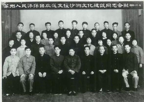 1965年11月15日,19名演职员工在离苏赴沙时,有苏州市委、市文化局领导,各评弹团团长等同志在光裕社聚会,举行欢送仪式并合影留念。沙洲县文教局顾向群同志来苏迎接团队。当大巴车达到沙洲,在汽车站就有沙洲县锡剧团和杨舍镇文艺宣传宣传队全体同志列队欢迎,彩旗招展、鞭炮声声、锣鼓喧天,将团队迎接到了县委招待所安顿。