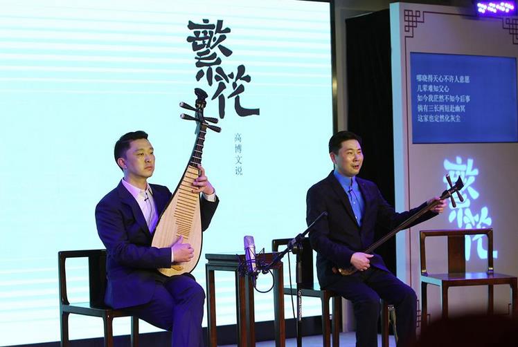 高博文(左)在大世界戏曲茶馆说《繁花》。
