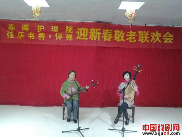 13日,常熟市曲艺家协会的弦乐书香评弹演出队走进春晖护理院,看望该院老人,并与护理院联合举办“迎新春敬老联欢会”。老人们喜爱曲艺,特别钟爱苏州评弹,由于身体原因无法到书场听书,弦乐书香演出队的队员们获悉这个消息后,主动上门免费演出,《新木兰辞》、《苏州好风光》等耳熟能详的弹词开篇,让老人们大饱耳福。参加演出的除杨静怡、孙向红、向阳、王燕瑾、余瑞轩、李青等曲协会员外,还有一位上海评弹团的青年演员冯晨曦,小冯正好休息在家,也欣然加入为老人义务演出的行列,他们的精彩演出得到院方和老人们的高度好评。