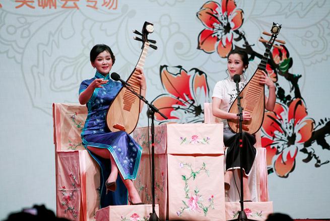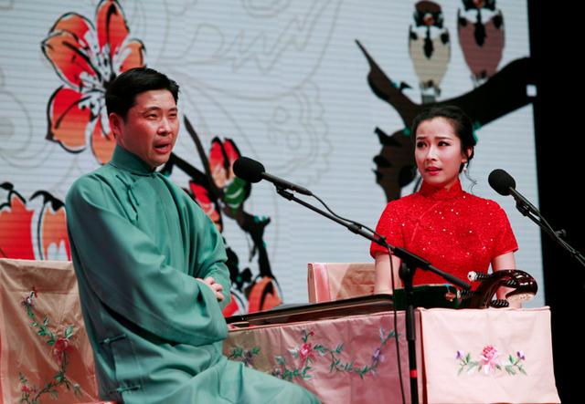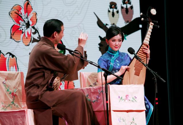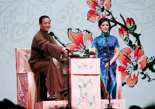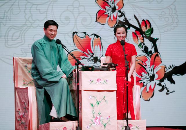 演出进入尾声,高博文副团长带着解燕、吴啸芸两位青年演员一起演出了《啼笑因缘•唇印风波》,说噱弹唱演俱全,给观众带来了阵阵笑声,也赢得了观众的阵阵掌声。