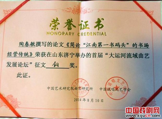 为承续运河文明传统,推动流域曲艺繁荣,8月9日至11日首届“大运河流域曲艺学术交流展演及研讨活动”在山东省济宁市隆重举行。作为活动的主要项目之一,“大运河流域曲艺学术交流研讨”于8月10日在济宁市经纬大厦杏坛厅举行,出席首届“大运河流域曲艺发展论坛”的有中国文联荣誉委员、中国曲艺家协会名誉主席、中国说唱文艺学会名誉会长罗扬,中国文联副主席、中国曲艺家协会主席、著名北京评书表演艺术家、国家级非物质文化遗产项目北京评书代表性传承人刘兰芳,中国艺术研究院常务副院长王能宪,中国曲艺家协会副主席、中国艺术研究院曲艺研究所所长、中国说唱文艺学会常务副会长吴文科,来自大运河流域地区相关科研单位、高等院校、曲艺院团等曲艺方面的专家学者、管理工作者与创演人员60余人。常熟市曲艺家协会主席陆建华,副主席、秘书长陶春敏参加论坛交流,陶春敏提交的论文《简论“江南第一书码头”的书场经营传统》获征文评比铜奖,得到中国艺术研究院曲艺研究所、中国说唱文艺学会等专家学者的好评。
