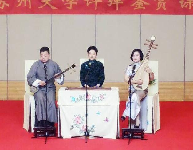 3月24日晚,苏州独墅湖高教区苏州大学图书馆学术报告厅灯火通明。第十三次苏州评弹鉴赏课在此进行。评弹艺术魅力展示演出:首先出场的是优秀青年演员许芸芸,她手抱琵琶一曲用吴侬软语的苏州方言演唱的《金陵十三钗》;第二个曲目由中国曲艺牡丹奖获得者袁小良、国家一级演员吴静、国家一级演员王瑾合作演出的《三笑·唐寅寻舟》;接着王池良表演了苏州评话《康熙·私访》最后压轴是金丽生和盛小云表演的弹词选回《武松·大郎做亲》。整整二个小时的演出,笑声掌声不断,这是一场高水准的艺术盛宴,是当今最走红的评弹演员的精彩演出。说、噱、弹、唱、演尽显其中,同学们大呼“过瘾”“太精彩了!”