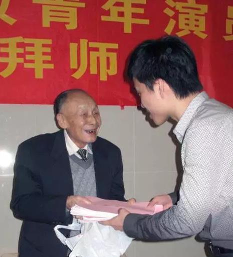 上图为李梁(右)拜老评弹艺术家华国荫为师的情景。