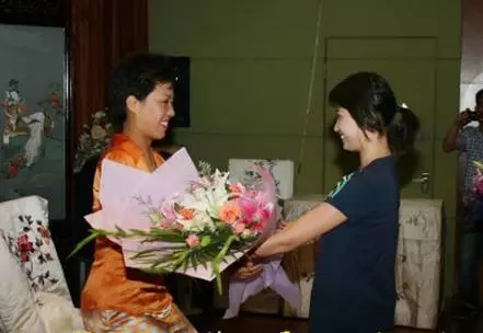 上图为沈秋英(右)拜国家一级演员周红为师的情景。