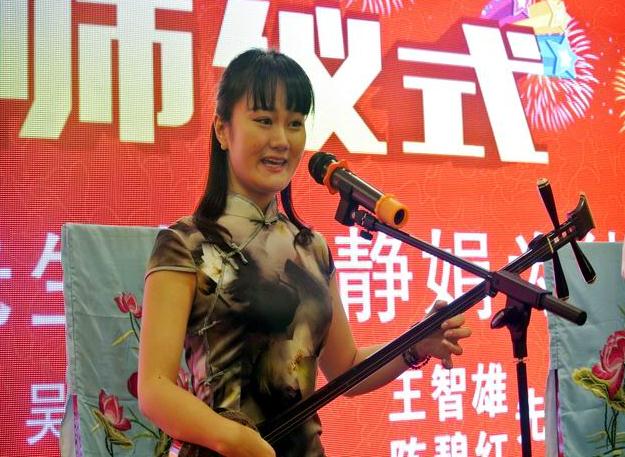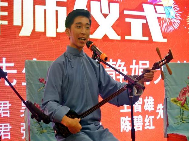 在拜师会上,六位学生都作了汇报演唱:李肇森唱了《梅竹》,吴玉君、吴玉琦唱了《杨八姐游春》,杨仕君唱了《密室相会》,王丹怡唱了《潇湘夜雨》,张雯君唱了《莺莺烧夜香》。在热烈的掌声中,由传承中心顾问陆嘉乐伴奏、亦师亦徒的季静娟唱了一曲《新木兰辞》,唱到“含笑出门寻伙伴”时,台上台下,齐声伴唱:“伙伴见她尽惊惶