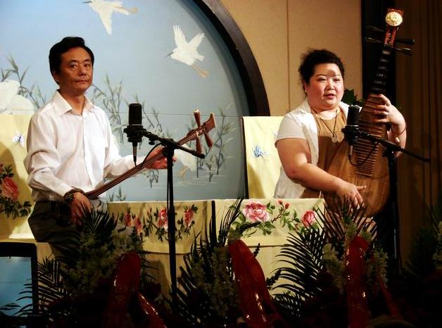 第二个节目,王玥弹唱《莺莺烧夜香》,李奕昂伴奏。大块头一曲唱来满头大汗,听众鼓掌要她“再来一个”,她没辜负听众厚爱擦擦汗又唱了一段蒋调《战长沙》。