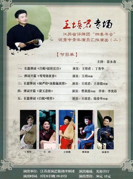 专场由省团团长、著名评话演员姜永春主持,他是这样介绍王培君的:王培君,是艺名,他身份证上名字是王培良,是江苏省演艺集团评弹团二级演员。1963年生于苏州。1983年毕业于苏州评校,跟师曹啸君,起了个艺名“王培君”,学习长篇《白蛇传》。后兼说《隋炀泪》《闹严府》,说噱弹唱演都具在曹派艺术风格,也是曹派艺术的传承与代表者。其表演的节目在全国省市多次获奖,曾多次出访及招待中央领导演出。