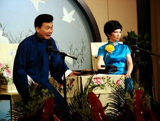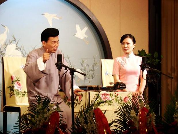 第三个节目,王培君二次上台,与王春霞合作说了一回《闹严府·汤勤骗真情》。王培君起汤勤这个角色,把汤勤阴险、狡猾的嘴脸演绎得淋漓尽致,一段张调《骗曾》也唱得很好。王春霞起曾荣,一段香香调《曾荣诉真情》,更是春霞的强项,赢得一片掌声。王春霞说,我与王培君合作已七年了。前五年说庞志英老师的《隋炀泪》,近两年说苏州团传承的本子《闹严府》,我们合作得很好,码头上业务不差。