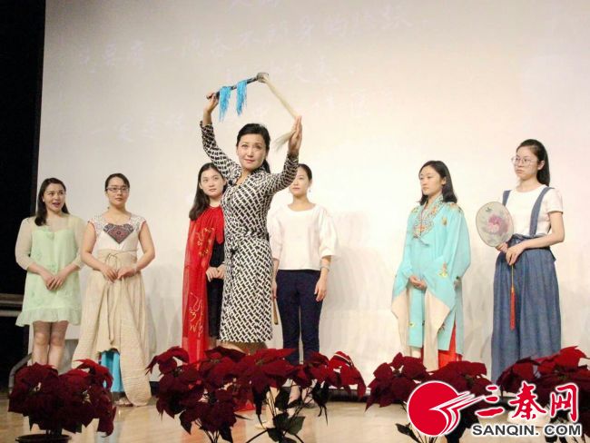 在现场,她向大家展示秦腔的身段、道具,并邀请在场的学生进行互动。学生穿起戏装,拿起道具亲身体验,模仿着演员转手帕、耍水袖……惠敏莉还亲自示范,教授学生规范的动作和姿态。现场互动环节气氛热烈,不时响起阵阵掌声。
