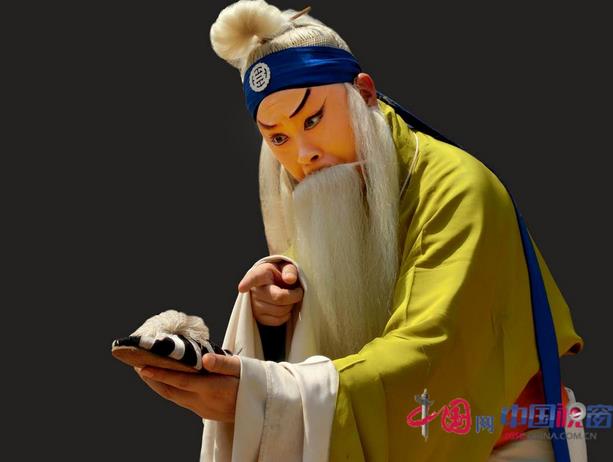 《祭灵》是一出唱、做并重的激情戏。是刘毓中先生当年的成名戏之一,我听过他的录音唱段。刘老录制“满营中三军们齐挂孝”这段唱时,已届八十三岁高龄,耄耋之年尚能保持那样的底气和功力,实在令人敬佩。看了王宏义演唱的《祭灵》,明显感觉到他在学习、探索刘老唱腔独特韵味之真谛和捕捉刘老“表演灵魂”之“精、气、神”方面,着实下了一番苦功。《祭灵》这一长段戏,用的是“苦音大踏板”的板式。第一句唱“满堂中”和“齐挂孝”后边的拖腔,就神似当年刘老的韵味。“荆州王亡魂听根苗”一句话中,“荆州王”后边的拖腔用的是长哨子音,难度极大。刘老在录制这段唱时,只拖了不到一半,刘随社在唱这句戏时,干脆省去了拖腔。王宏义却能将其一拖到底,而且旋律韵味相当到位,在老生行当中实不多见。论及做工,王宏义更不含糊。《祭灵》这出戏,对刘备这个人物角色的要求不仅是声情交融,还要求唱做并举。王宏义的才艺恰在这里派上了用场。刘备哭祭关、张,一直是在颤巍巍的状态下进行的,尤其是在几个唱句后的拖腔和过门音乐中,头上缨花、孝结弹抖不已,脚下碎步穿花平稳挪移,髯口、水袖飘然飞动,且与音乐旋律、敲击鼓点协调一致,浑然一体,臻于出神入化的艺境。