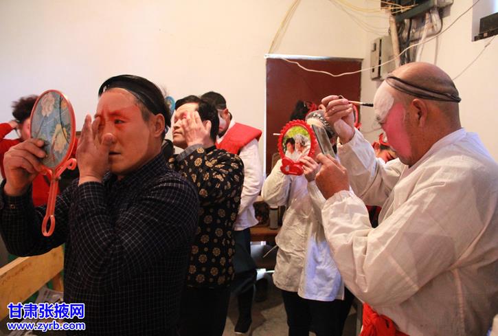 上午10点钟,离戏开演还有两个小时,一些戏迷已经三三两两来到戏台前等候秦腔开演;演员们也在后台忙着化妆,穿戏衣,对台词,为演出做着准备。上午12点钟,秦腔传统剧目《忠保国》随着铿锵的伴奏和高亢的唱腔正式开演。十里八乡的乡亲们或站或坐在三轮车上聚精会神的看起了戏。