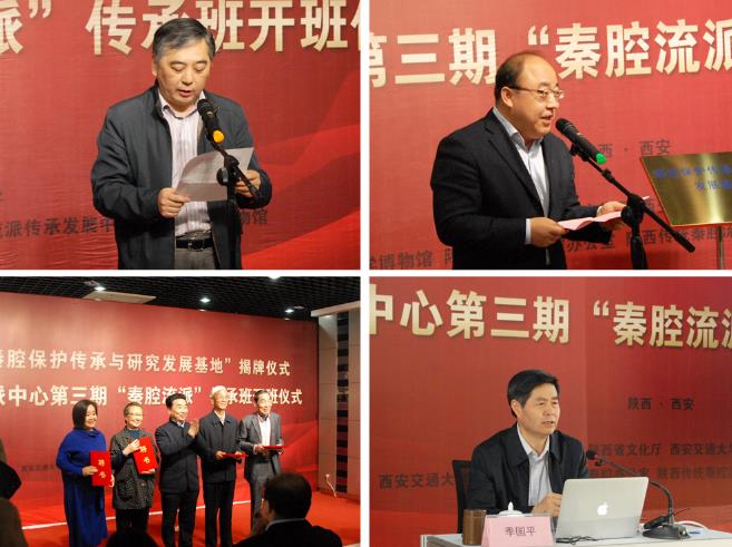 揭牌仪式由交大博物馆副馆长李一鸣主持,中国戏剧家协会分党组成员、秘书长崔伟宣布授予陕西秦腔博物馆“秦腔保护传承与研究发展基地”的批复。西安交通大学宫辉副书记,中国戏剧家协会分党组书记、驻会副主席季国平先后为基地的创立致辞,流派中心演出部部长孙伟华介绍流派中心主要工作和第三期流派传承班的工作设想。陕西省文化厅厅长刘宽忍为第三期传承班的导师颁发聘书。