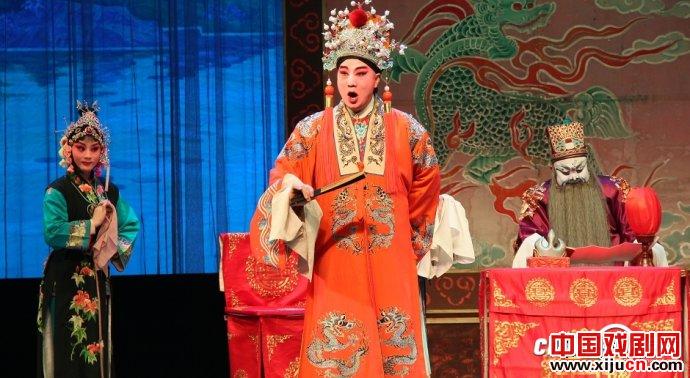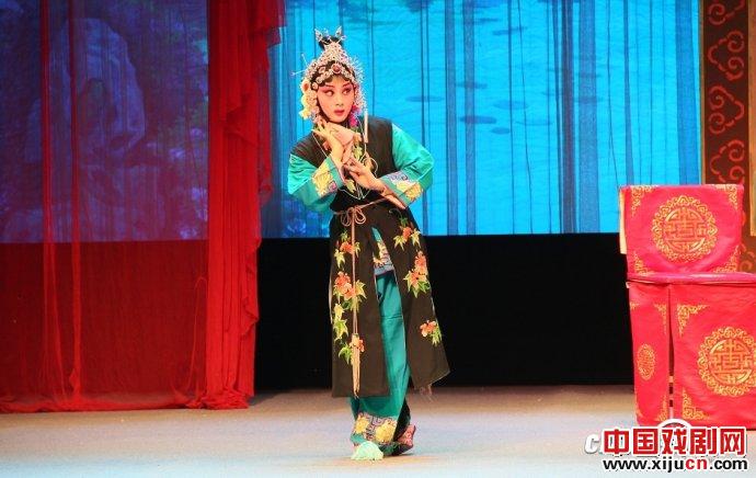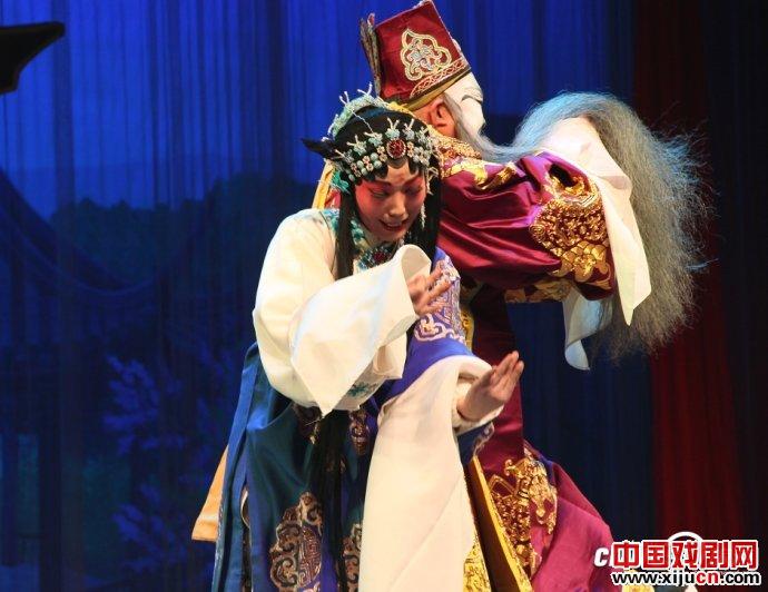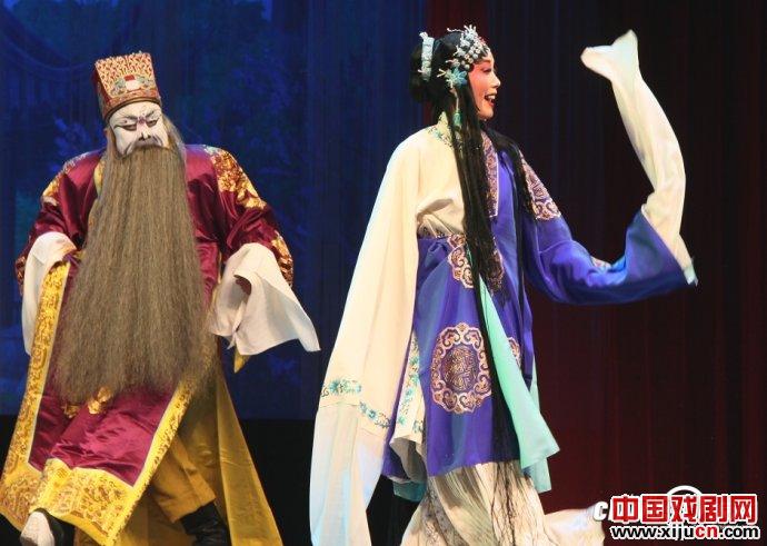 《装疯》一幕,秦二世闻言艳容疯了,依然要艳容上殿。艳容无奈上殿,对父亲的无耻和黄帝的无道失望之极,于是上殿装疯,演了一出“疯女闹朝堂”的闹剧。艳容的内心,由痛转悲,由悲转怒,于是抛下头冠、脱去霞帔,当堂呵斥秦二世荒淫无道、父亲卑鄙无耻。