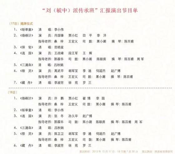 近日,借《第十一届中国艺术节倒计时一周年优秀剧目展演》契机,由陕西省文化厅组织牵头,带领秦腔“流派传承班”在陕西省戏剧研究院为广大陕西观众带来了一系列精彩演出,具体节目单可参考如下: