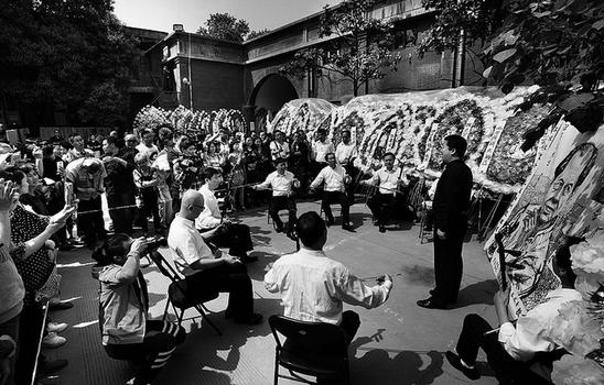 昨天,老腔艺人张喜民和他的同伴们举行了一场特别的演出。相同的唱词,不同的情绪。当锣鼓敲响,仍然是撞击人胸肺般粗犷豪放的曲调,但却透露出无比的苍莽、苍凉与悲壮。一曲唱罢,张喜民哭了,队伍中,那些年过半百的老艺人们也哭了。有人说“先生,给您再唱一遍您最爱的老腔,您听到了吗?”不少前来悼念的市民都热泪盈眶。