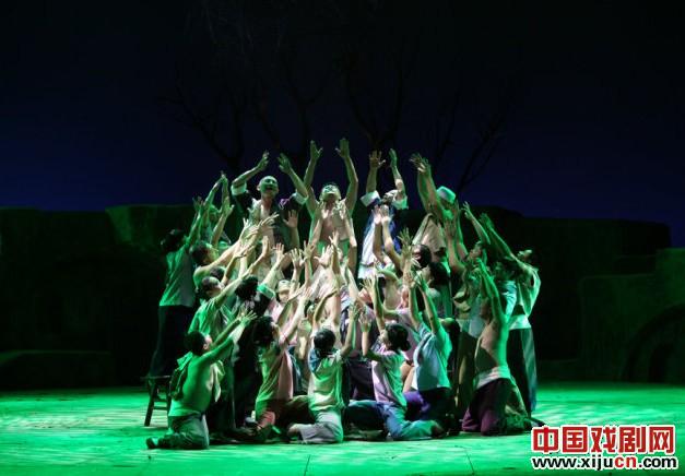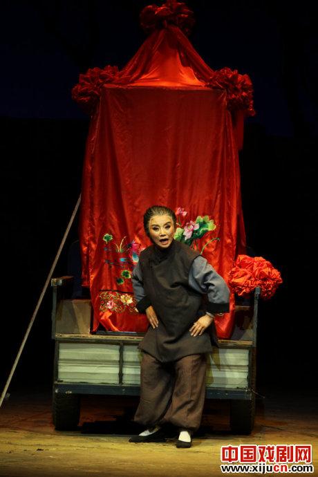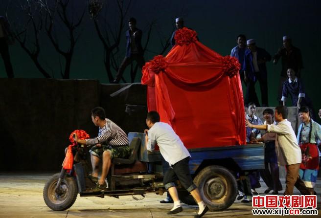 现代很多戏都希望通过一个意象来贯穿整部戏的始终,秦腔《花儿声声》也是如此,将花儿这首宁夏民歌作为情节的一条导火索,推动剧情发展。不过感觉用的有点多,就会给观众故意炫耀之感。这部戏很多处都在用花儿这首歌做文章,说服力不强。同时,这部戏女主角也是每场讲述人,这样的设计感觉不是太适合戏曲,有点破坏戏曲本身的情境感。这部戏最让我疑惑的是,为什么会把真的电动三马车开上舞台,以写实著称的话剧未必也会这样做吧?