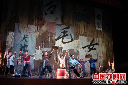 天津版《白毛女》首演场面真的是太震撼了,在白毛女这个剧中加入的老腔唱段真可谓是点晴之笔,几次把演出推向了高潮。老腔那种沙哑奔放的唱法,淋漓尽致的表现了那个万恶的会里,敢怒而不敢言的穷苦老百姓们来自心底的呐喊。