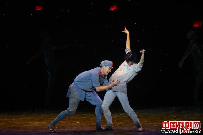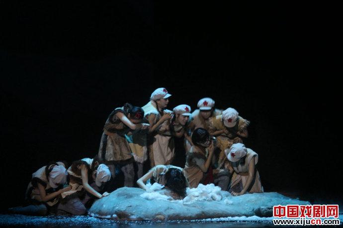 记得一位学者曾经说过,现在很多新创排的舞剧,都被恢弘的舞台场面所掩盖,舞蹈在这种场面前黯然失色,他建议把所有的舞美都无限制的缩小,每部舞剧来只比拼舞蹈的魅力。当然,现在所有的戏剧包括舞剧,都已经成为一门综合的艺术,舞美、音乐也成为这门艺术里必不可少的元素,也是我们欣赏戏剧、评判戏剧的一个重要关注点,但是舞美是为戏剧本身服务的,喧宾夺主肯定是失败的。而今天晚上的舞蹈诗《天边的红云》最大的感觉就是它突出了舞蹈的本体地位,全剧所有的焦点基本全部凸显在舞蹈之上。全剧背景都是灰色和黑色的背景,并且灯光以追光为主,所以人们的关注只能在演员的舞蹈之上,用舞蹈来展现故事情境,用舞蹈来抒发感情,用舞蹈来感染观众;并且整部戏结构严谨,舞蹈语言丰富,将女战士的柔情与写意的舞蹈结合起来,生动贴切,一顿一足皆散发着一种诗意美,如果用悲壮来形容男战士的场面,那么用凄美来形容红军女战士最恰当不过。