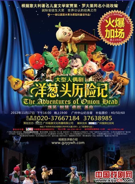 2012年11月17日下午4点钟在中山纪念堂上演的大型儿童人偶剧《洋葱头历险记》原定只演出一场,但自10月22日开票以来,得到广大观众的热烈追捧!应客户要求,瑜源文化特向广州文化管理部门申请加多一场演出!加场时间定为11月17日晚上7点钟,惠民补贴票价40/50/60不变!演出加场申请等待审批中!请大家相互告知!