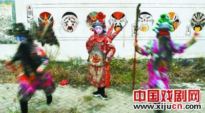 在伏岭镇戏台前,徽剧演员们正在紧张排练。