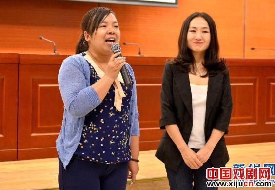 8月12日,公益舞台剧《愿望树》的原型人物之一、北京海淀区培智中心学校教师米洁(左)在导演王蝉的陪伴下出席发布会并讲述个人的职业体会。